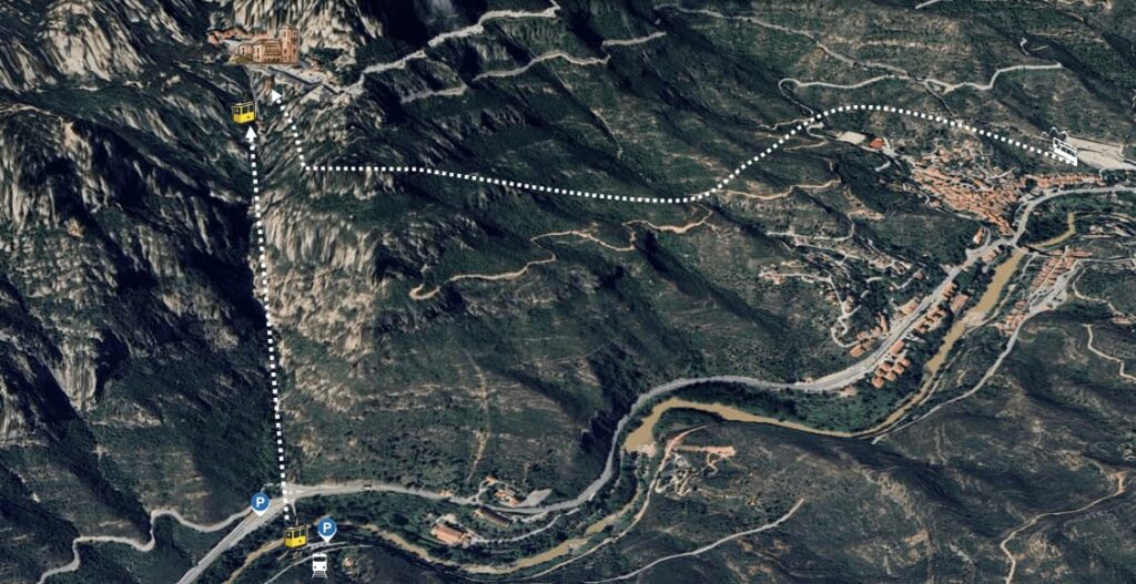 The lower station of the Montserrat cable car (Aeri de Montserrat) is located next to the Aeri de Montserrat train stop, on the R5 line from Barcelona, and right by the Llobregat River. If you are coming by car, you can park directly next to the station, just before crossing the bridge. The access is very easy and well signposted, so you won’t have any trouble finding it. If you arrive by train, simply get off at “Aeri de Montserrat” station, and you will see the cable car right in front of you.